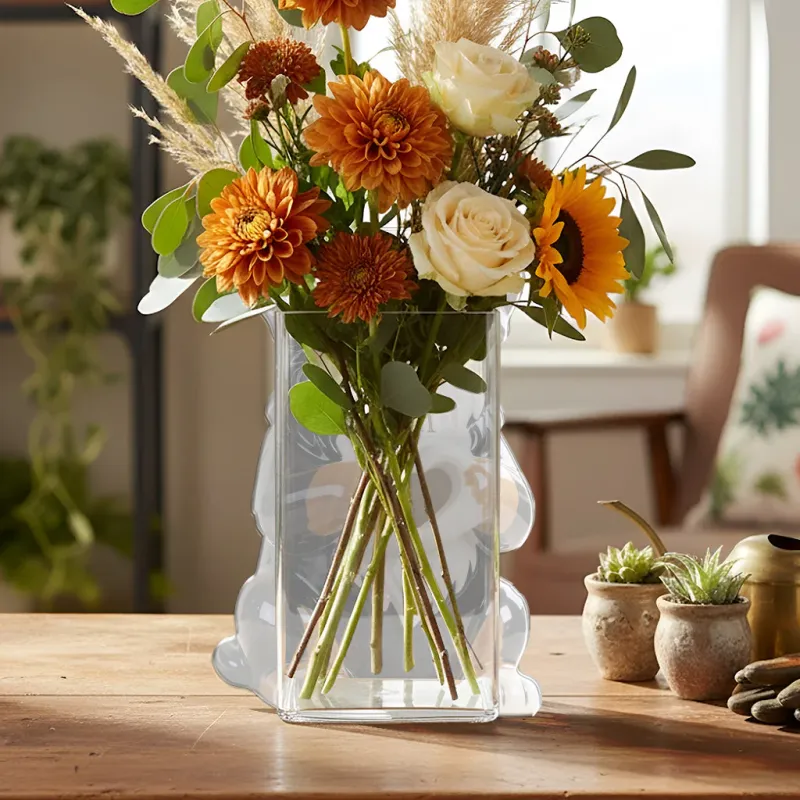 Het acrylpaneel aan de voorkant is aan één kant bedrukt met levendige, hoogwaardige kleuren, wat diepte en persoonlijkheid toevoegt en tegelijkertijd een strakke, moderne uitstraling behoudt. De hoogte en verhoudingen van de pot maken hem geschikt voor kleine planten, verse bloemen, gedroogde arrangementen of kunstboeketten, waardoor het een flexibel decoratiestuk is voor huizen, kantoren of om cadeaus te geven.