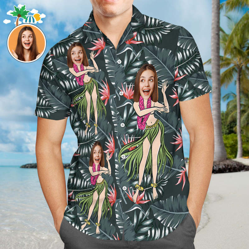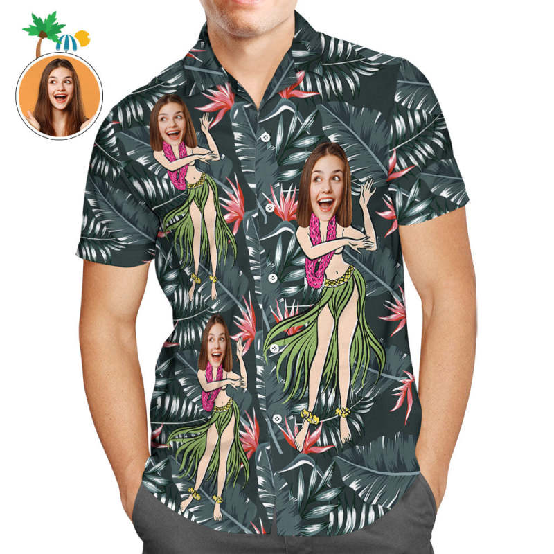 Custom Face Men Hawaiian Shirt Leaves Hula Green Tropical Shirt