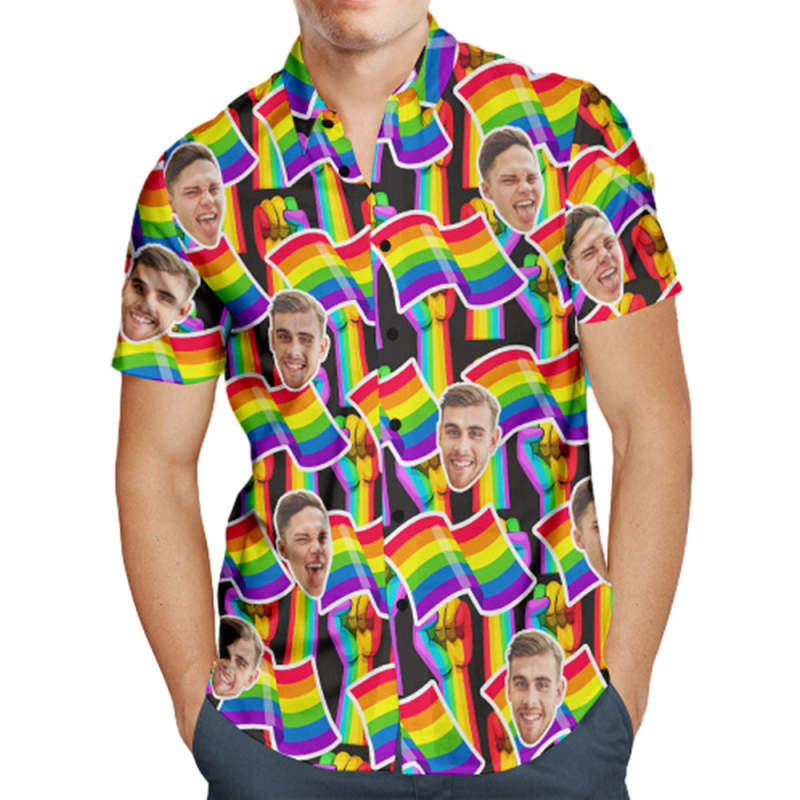 Aangepaste Gezicht Mannen Hawaiiaanse Shirts Gepersonaliseerd Lgbtq Gay Pride Shirt - Regenboogvlag