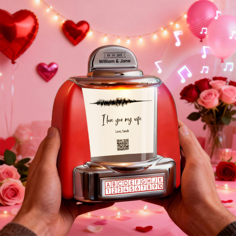Gepersonaliseerde Mini-jukebox Met Qr-code En Geluidsgolf – Bluetooth-jukebox Met Foto, Muziek En Tekst, Een Ideaal Cadeau Voor Stellen.