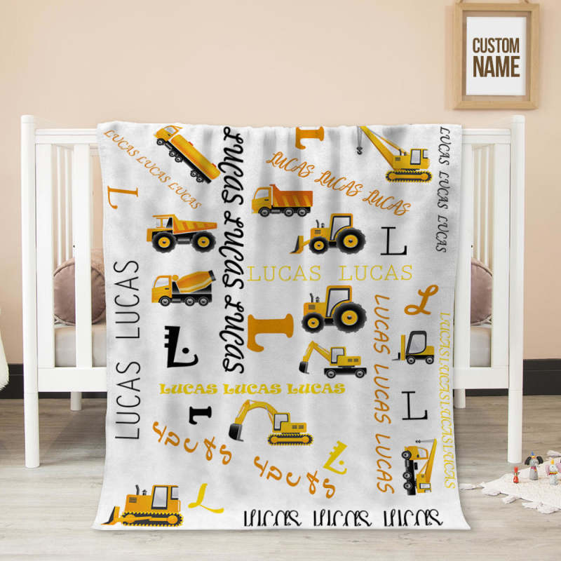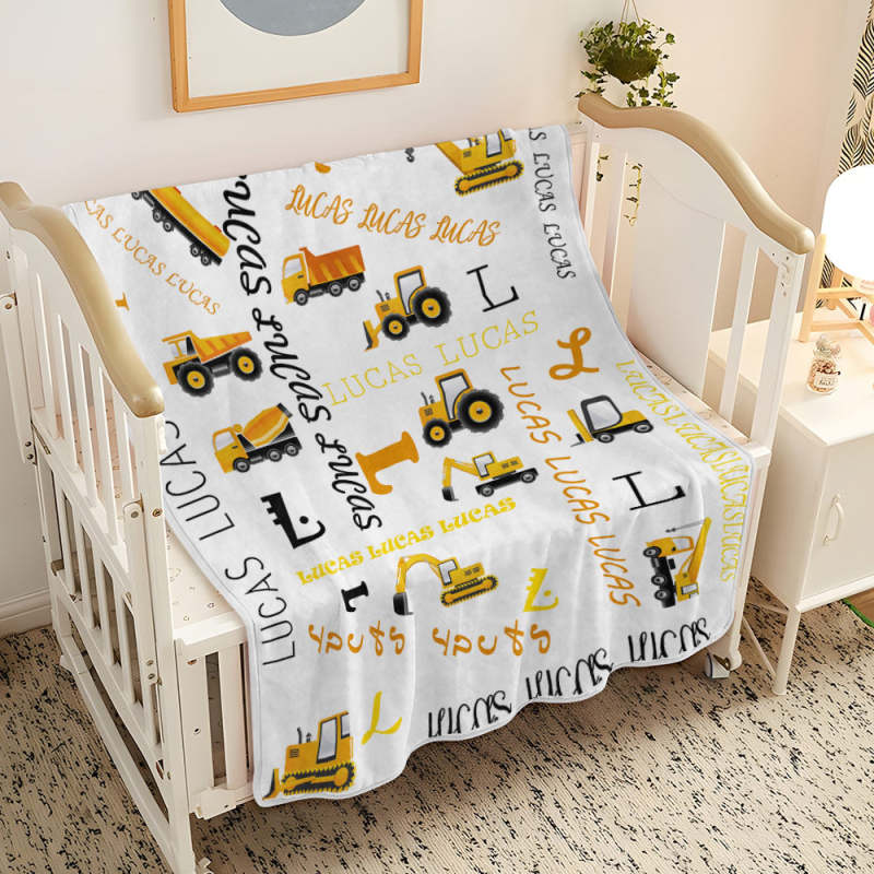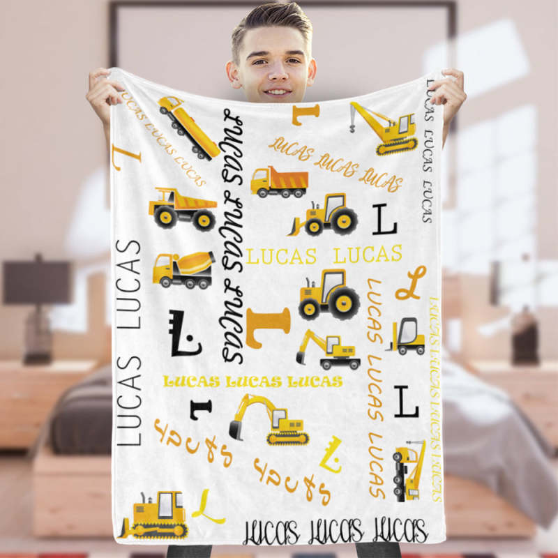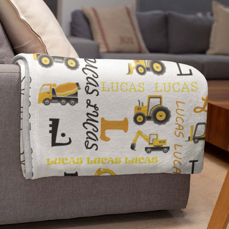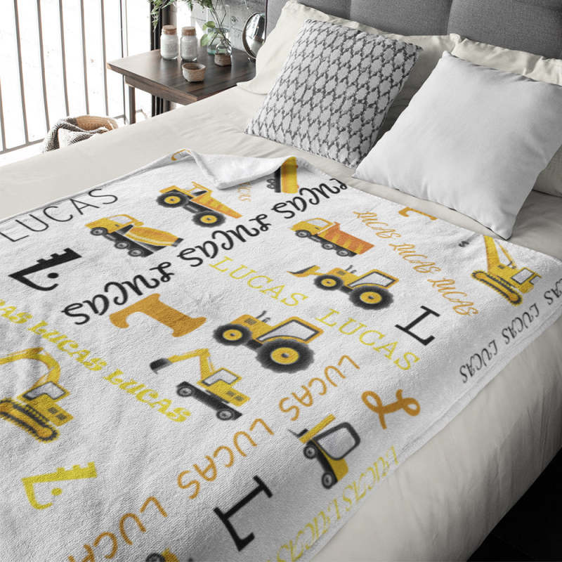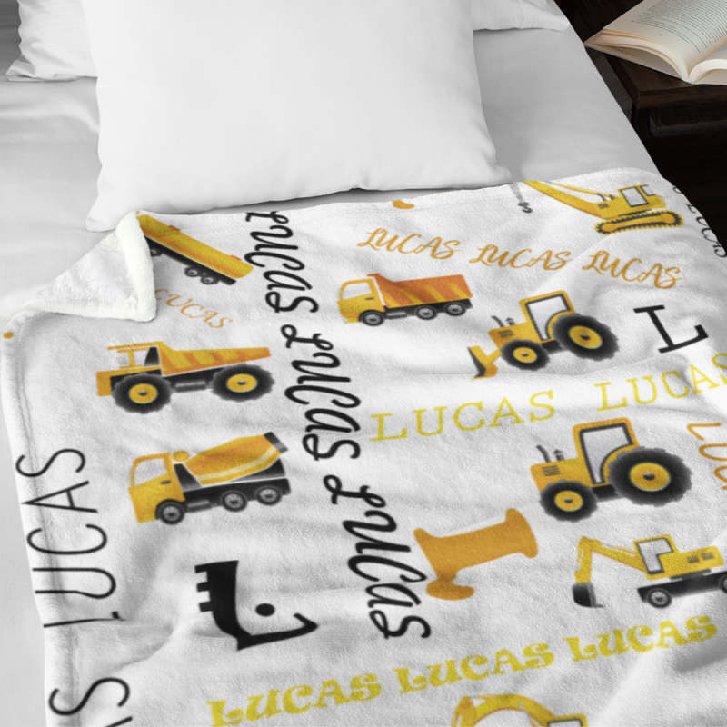 Deze gepersonaliseerde deken met bouwtruckthema is een perfect cadeau voor elke kleine klusjesman, nieuw of oud! Blijf warm en gezellig in een ongelooflijk zachte deken met sherpa-rug en fleece-top bedrukt met een schattig bouwvrachtwagen- en bouwuitrustingspatroon, een gepersonaliseerde vrachtwagen met jouw naam/tekst naar keuze.