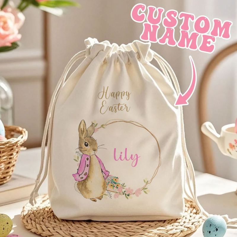 Gepersonaliseerde Schattige Peter Rabbit Canvas Tas Met Trekkoord, Initialen En Naam, Paaseierenjachtmandje, Verjaardagscadeau Voor Kinderen