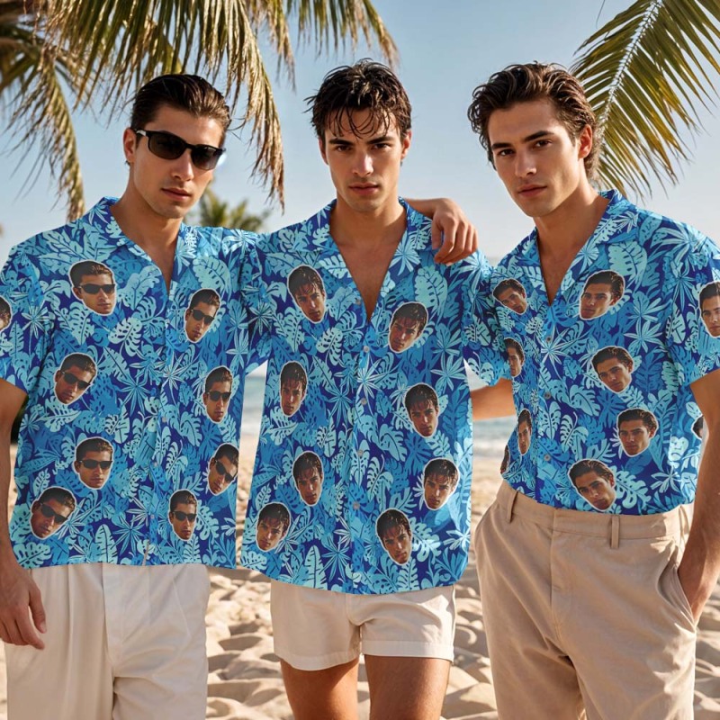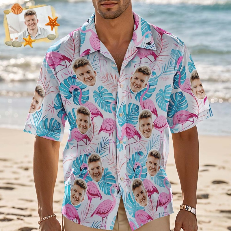 Gepersonaliseerd Roze Blad Flamingo Hawaiiaans Shirt Met Aangepaste Gezichtsfoto Voor Mannen, Leuke Zomervakantie-outfit